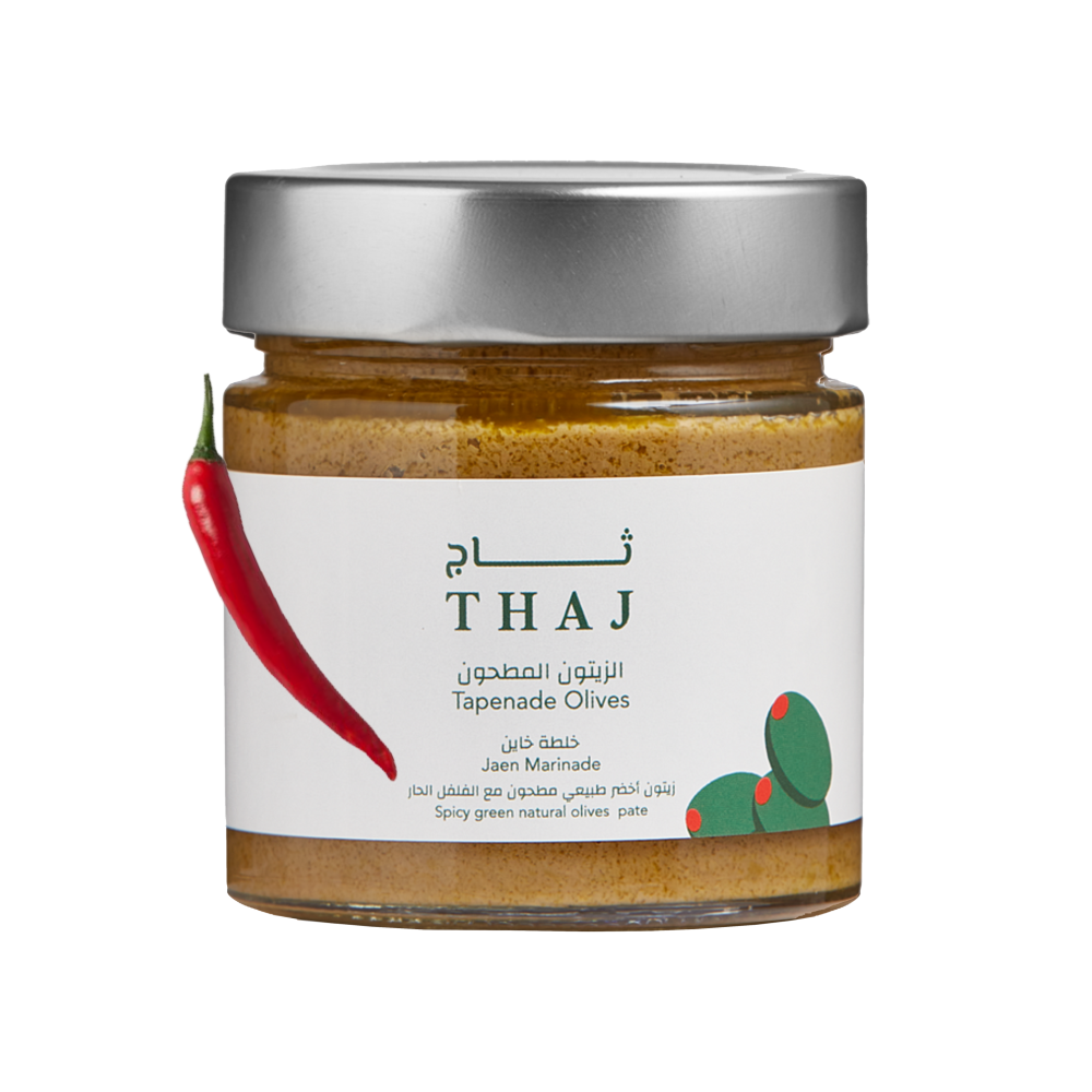 زيتون أخضر طبيعي منزوع النوى، مطحون وممزوج بزيت الزيتون البكر وتوليفة من البهارات الفاخرة، مستوحاة من نكهات مدينة "خاين" الأندلسية المشهورة بزيتونها الأصيل.